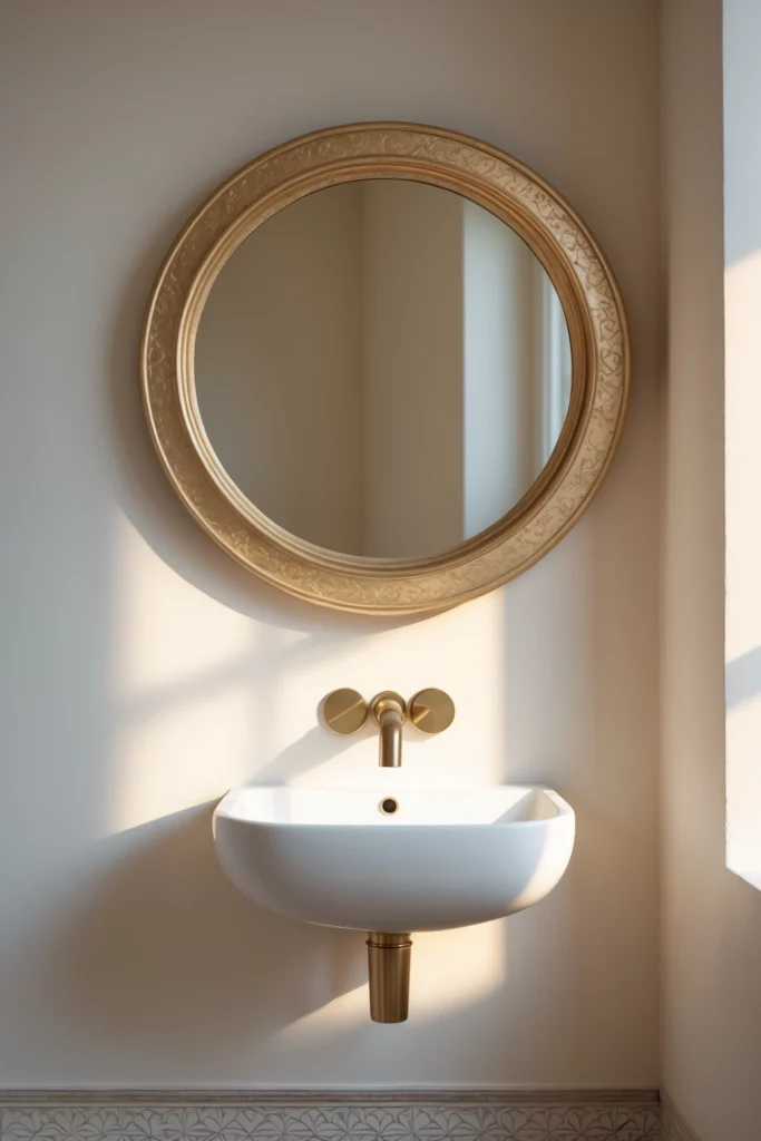 I swapped out the plain mirror for a round one with a gold frame. That one update made the entire bathroom feel upgraded. You’ll be surprised what a mirror can do!