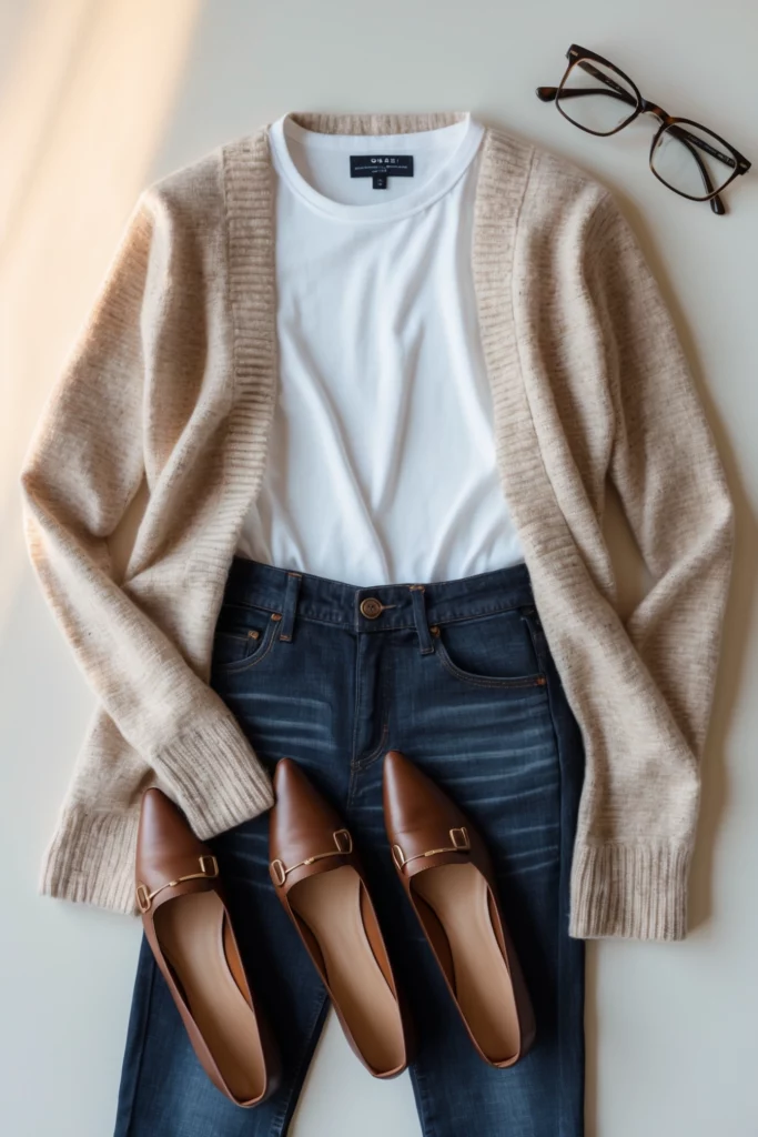 A neutral-toned cardigan over a tucked-in tee and high-waisted jeans is one of my go-to looks. It’s easy, flattering, and endlessly wearable.