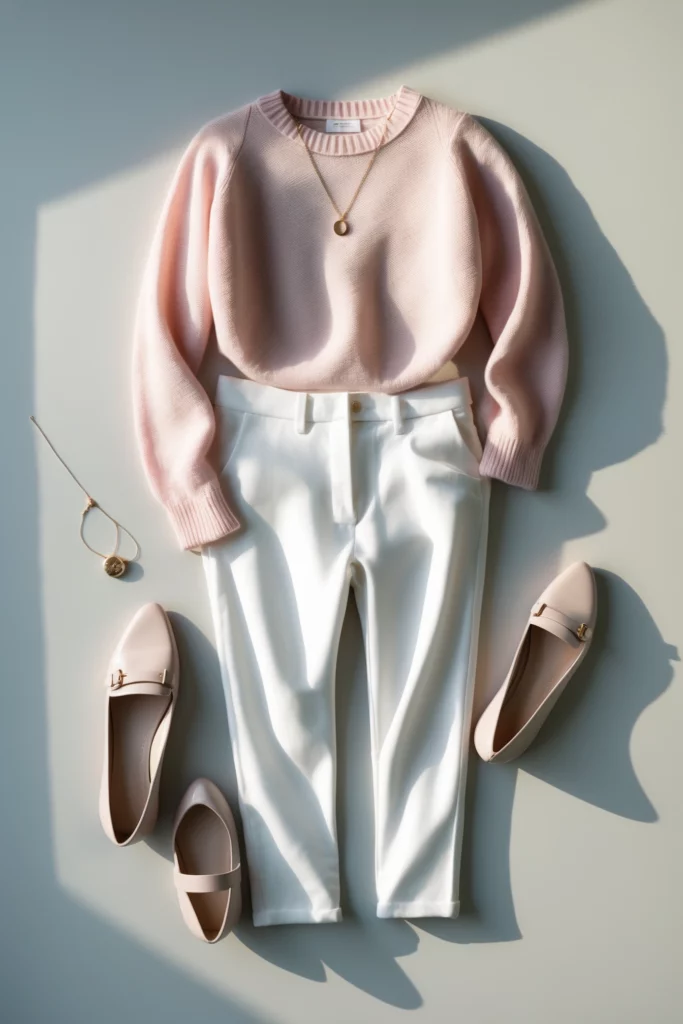 A lightweight knit in muted tones with white pants always feels fresh. Add a delicate necklace and soft makeup for an airy, spring-ready look.