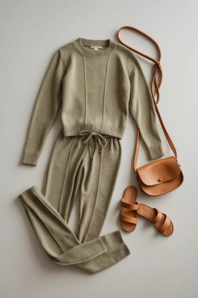 I love matching knit sets in colors like olive or oatmeal. They’re cozy, chic, and don’t need much styling—just simple shoes and a clean bag.