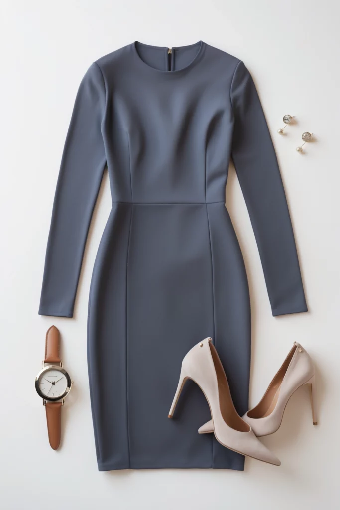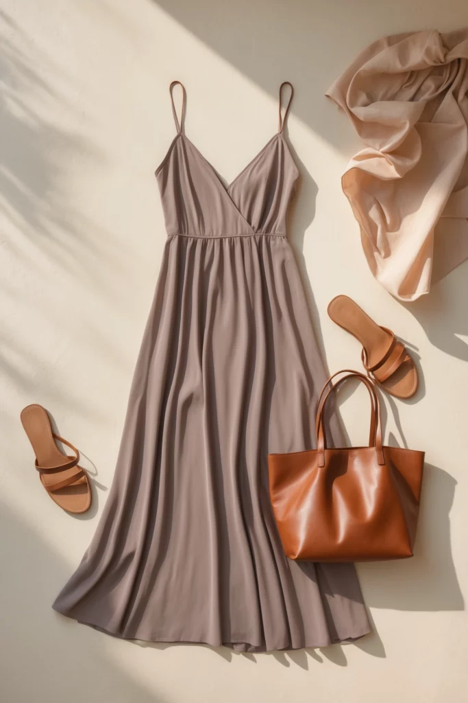 A flowy taupe or soft-grey midi dress can be dressed up or down. I usually style it with low sandals and a clean leather tote.