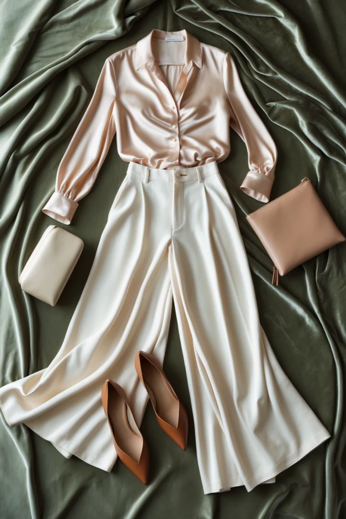 A silky blouse in cream or blush tucked into relaxed trousers brings a touch of softness and polish. I often wear this when I want to feel refined but comfortable.