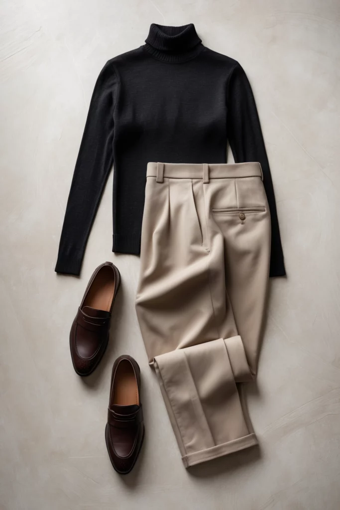 A fitted black turtleneck with cropped trousers and loafers gives off quiet confidence. Add a sleek watch or bag, and you’re good to go.