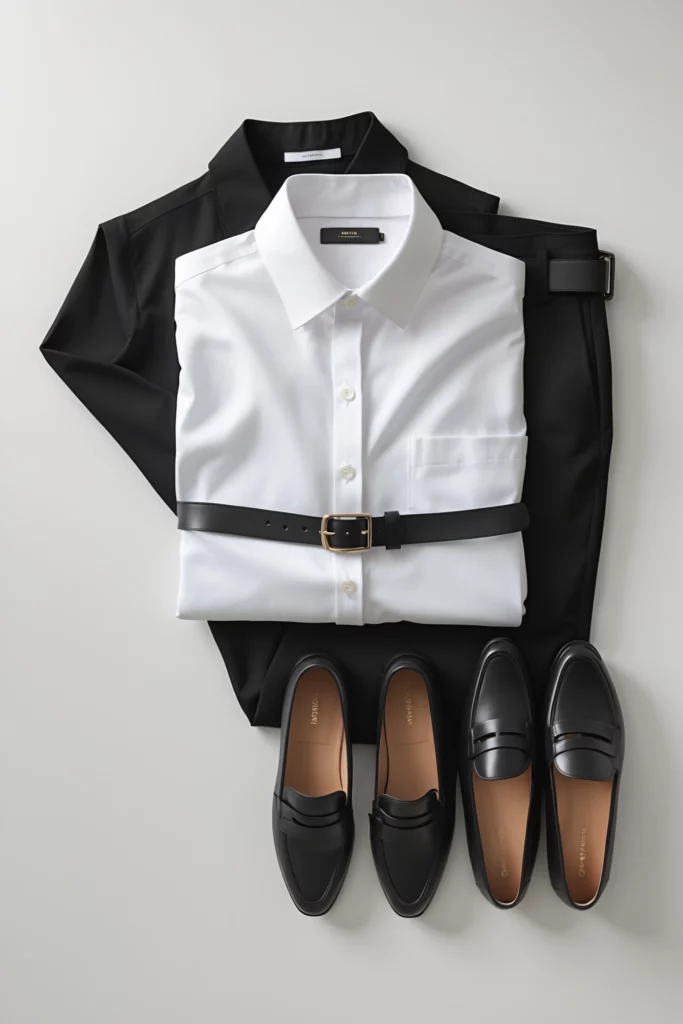 A crisp white shirt tucked into slim-fit black trousers is a timeless look. Add a belt and small hoop earrings for quiet sophistication.