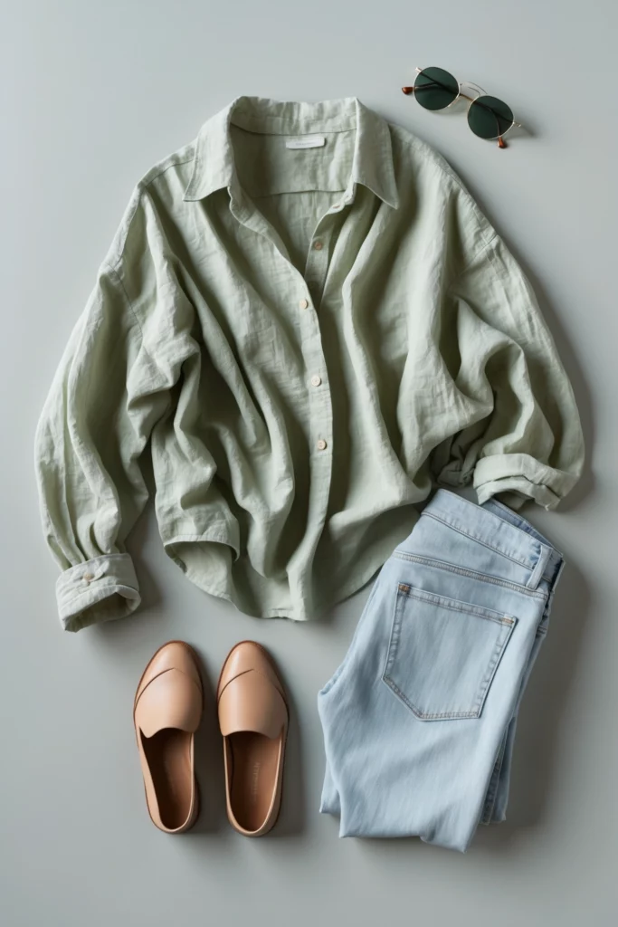 I love an oversized linen shirt in ivory or sage, paired with straight-leg jeans and slip-on shoes. It feels relaxed but still intentional.