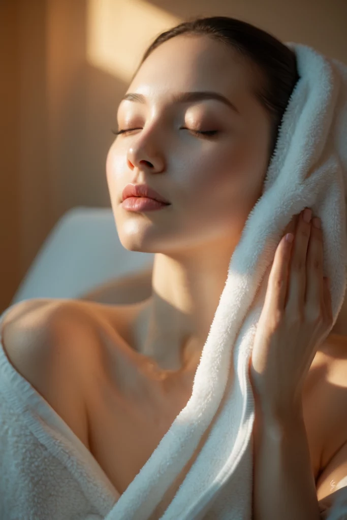 After washing your face, gently pat it dry with a soft towel. I used to rub my face and didn’t realize how much damage that caused. Be kind to your skin, and it will show.