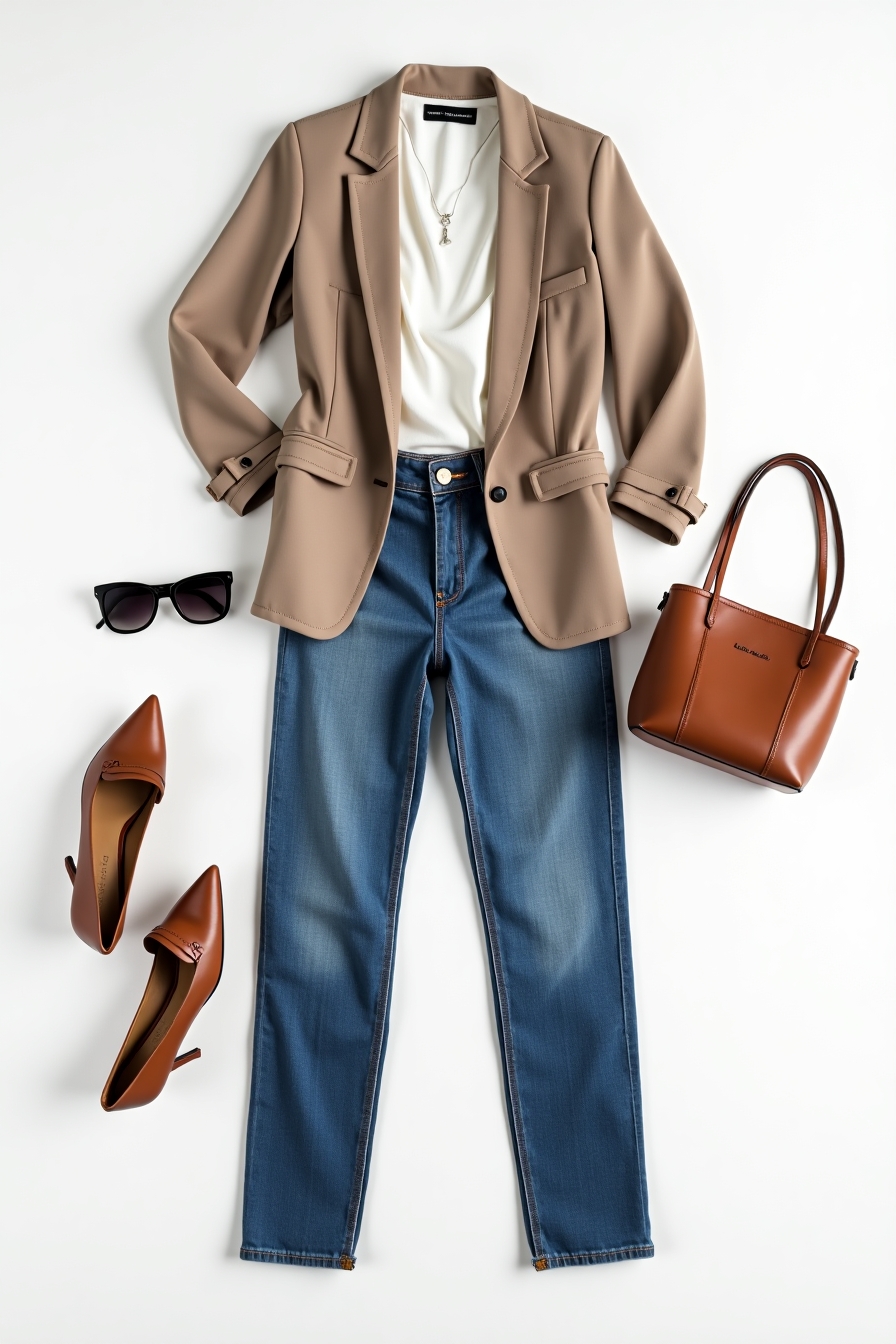 I think high-waisted jeans are a fantastic way to create a long, lean look. You can pair them with a structured blazer to add a touch of sophistication to your casual outfit. This is a great way to look stylish and put together no matter what you’re doing. I think this combination is perfect for running errands or meeting friends for coffee.