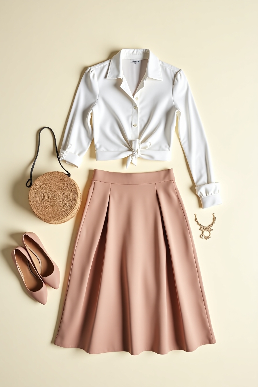 An A-line skirt is always a flattering choice because it beautifully highlights your waist and skims over your hips. I recommend pairing it with a fitted top to balance the silhouette and create a harmonious look. This outfit strikes the perfect balance between feminine and versatile, making it ideal for both work and play.