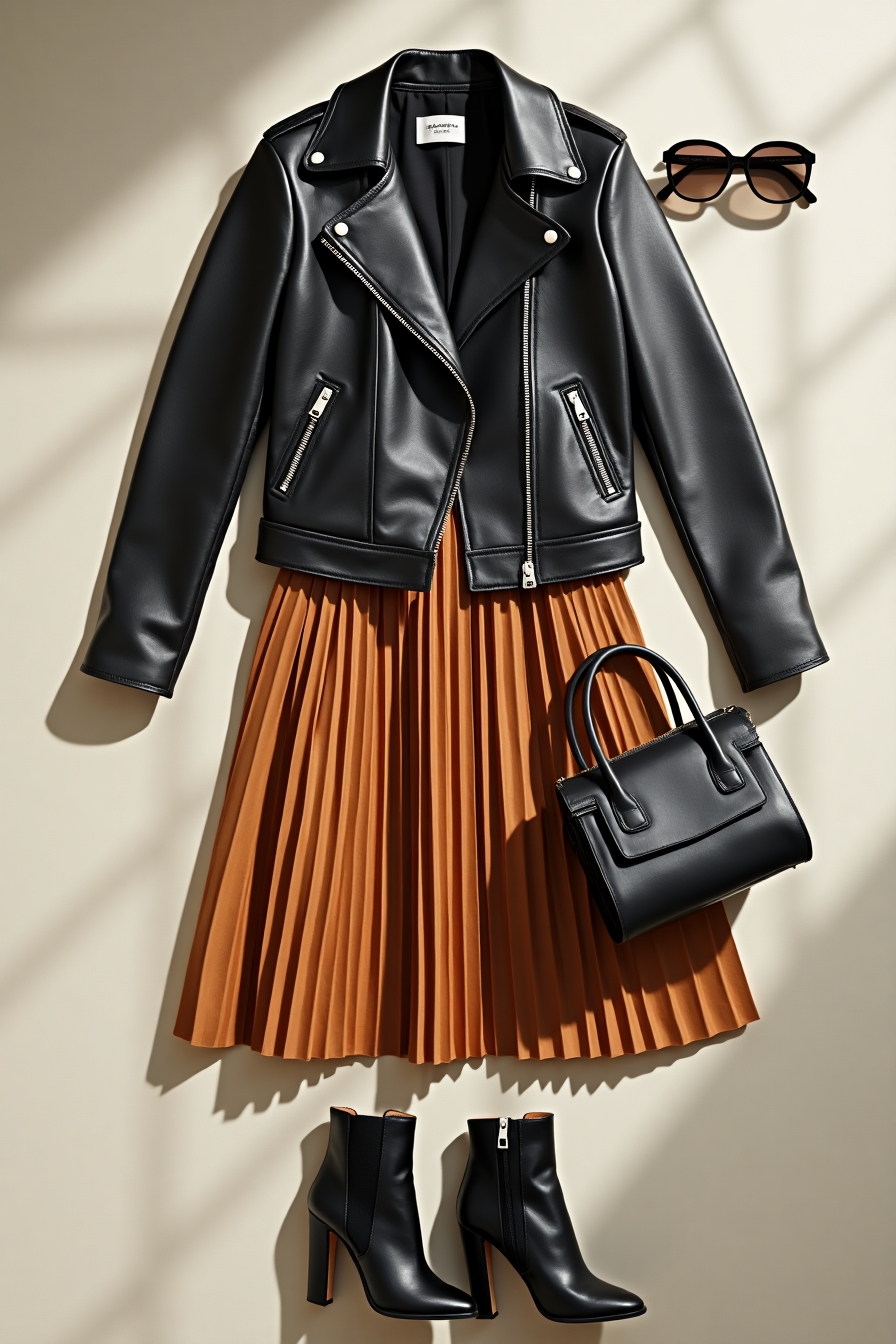 A leather jacket is a great way to add a bit of edge to any outfit. I particularly love pairing it with a pleated midi skirt to create a stylish contrast between the two pieces. This combination is fantastic for when you want to mix classic and modern elements, making it a versatile option that works for both day and night.