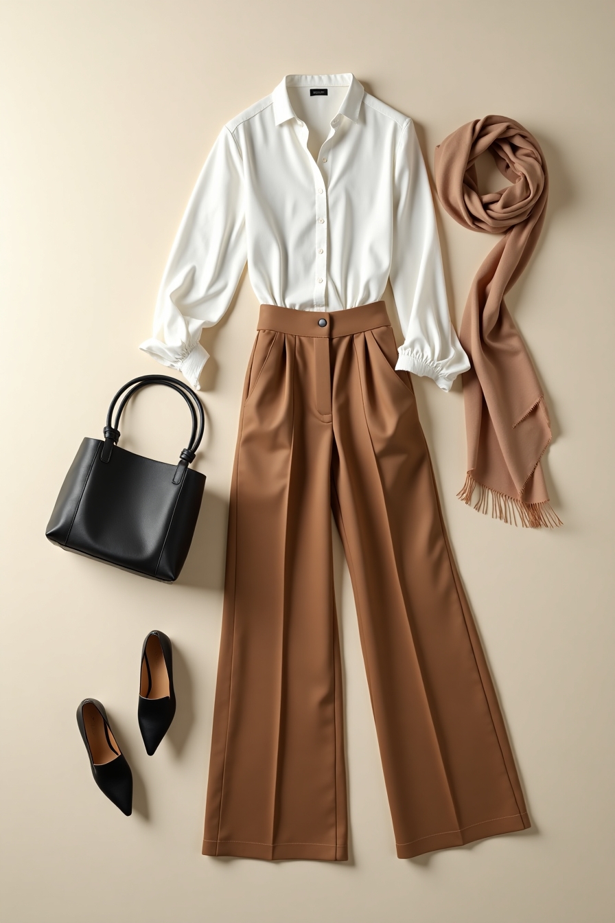 Wide-leg trousers are a fantastic choice; they’re not only comfortable but also incredibly flattering. I recommend pairing them with a tucked-in blouse to create a balanced silhouette that accentuates your figure. Adding a belt will further define your waist and enhance the overall look. To complete the outfit, you can opt for stylish flats. This combination makes for a versatile ensemble that’s perfect for any occasion!