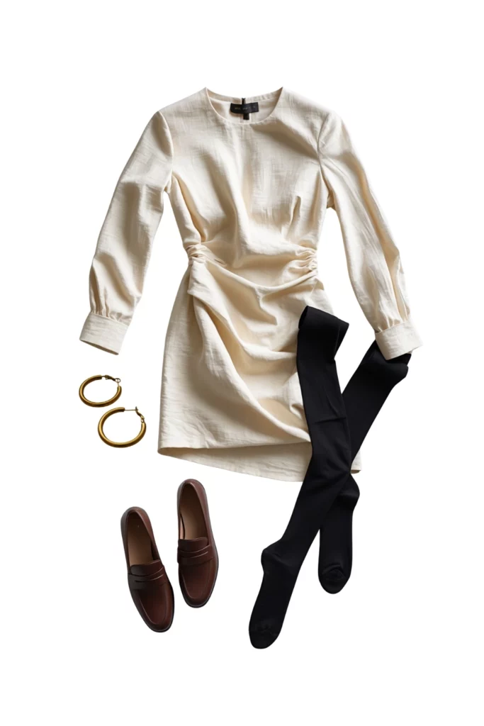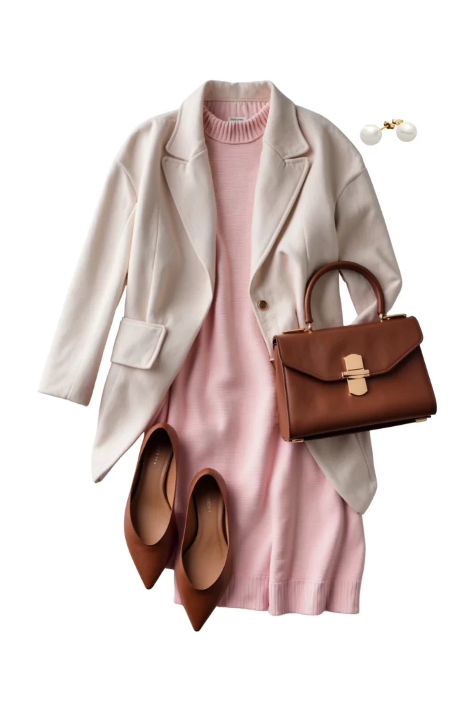 This look is elegant and comfortable. I love how a soft, oversized blazer adds structure to a cozy knit dress.