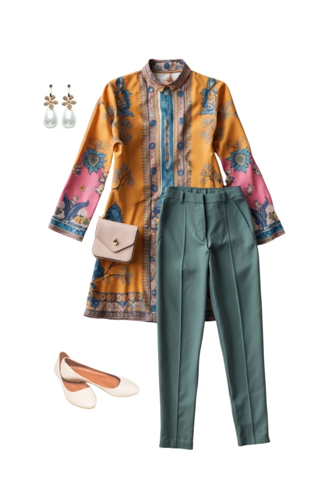 If you love a relaxed yet put-together outfit, an elegant tunic with slim-fit trousers is a great choice. I always find tunics flattering because they drape beautifully and offer a comfortable fit. When paired with tailored trousers, the outfit feels modern and stylish without being too tight or restrictive. You can finish the look with simple jewelry and stylish loafers.