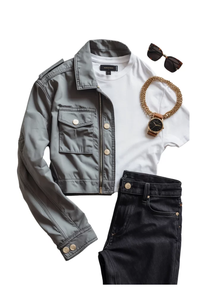 Utility jackets are in this season, and cropped versions look sharp and modern. I like layering mine over black denim and a soft tee.