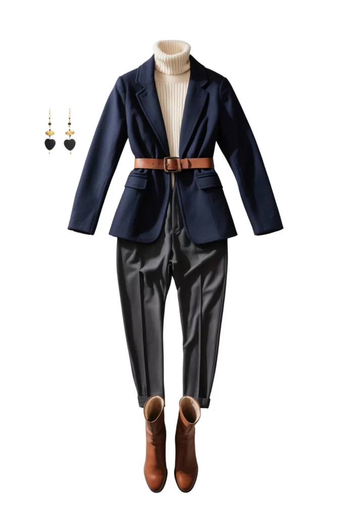 This combo feels structured and cozy at the same time. The belt adds definition to your waist, and a soft turtleneck keeps you warm.
