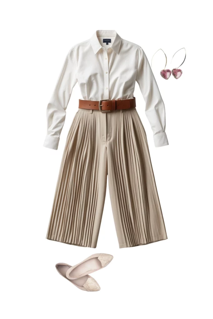 Pleated culottes are trending, and they’re surprisingly flattering. I love how they add movement and elegance.