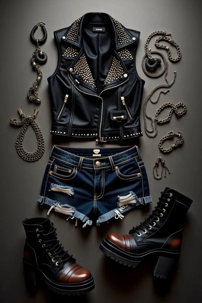 For a more daring look, try a studded vest with high-waisted shorts. This outfit is perfect for summer concerts.