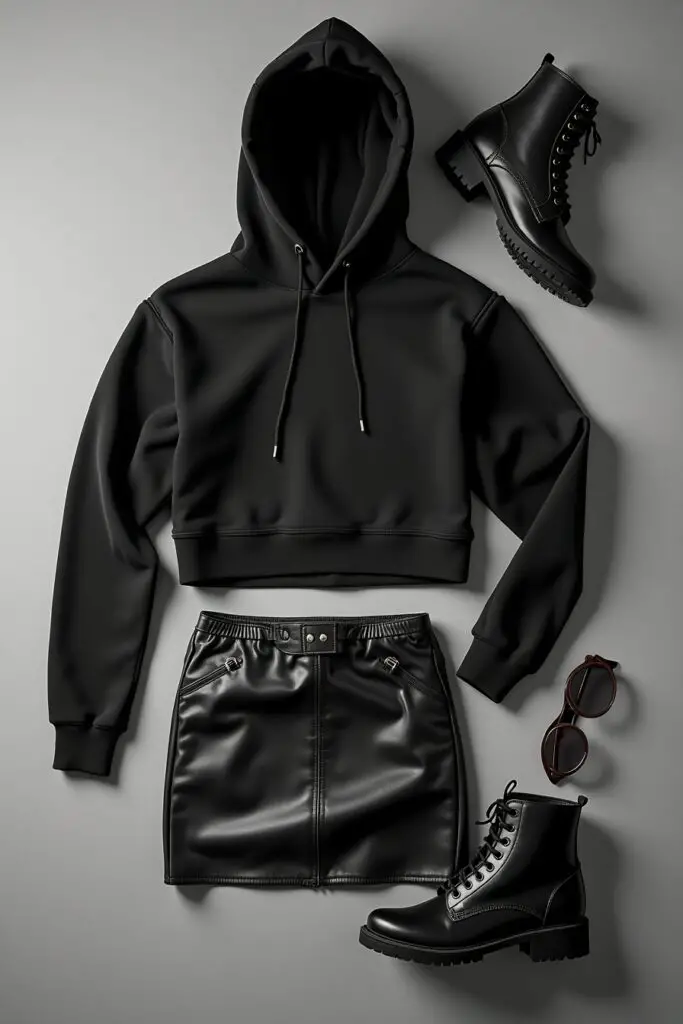 A cropped hoodie gives a sporty twist to a rock concert outfit. Pair it with a leather skirt for a chic, modern look.