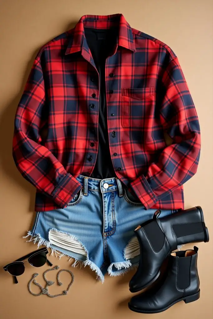 An oversized flannel shirt is a comfortable and stylish choice. Wear it over a tank top with cut-off denim shorts for a relaxed, yet edgy look.