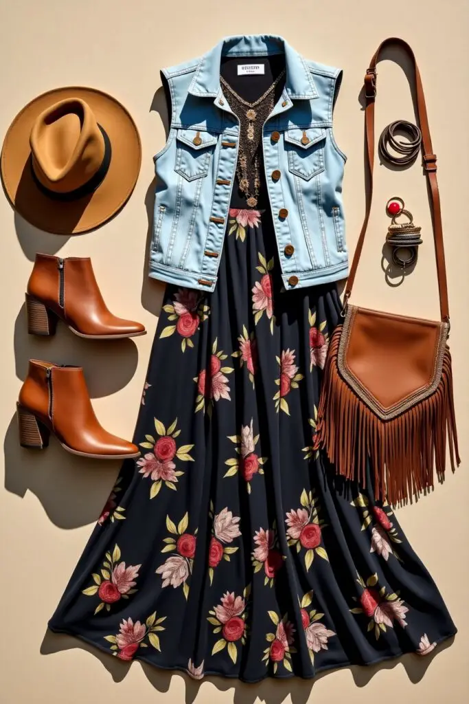 For a unique concert look, try layering a denim vest over a maxi dress. This mix of casual and boho styles is perfect for an outdoor concert.