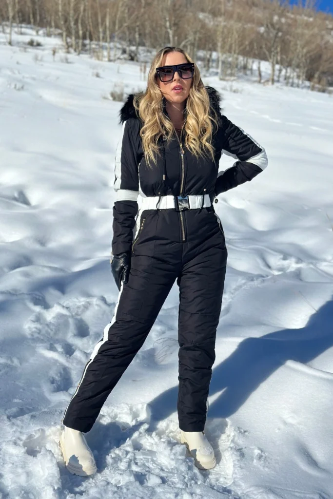 Style Tip: Belted ski suits give a flattering silhouette on the slopes.