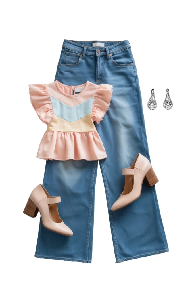 This look gives a balanced shape. The flared hem of a peplum top sits nicely over wide leg jeans, especially if you’re going for a soft, romantic style. I’ve worn this to brunch with friends, and it always feels a little dressy without being too much.