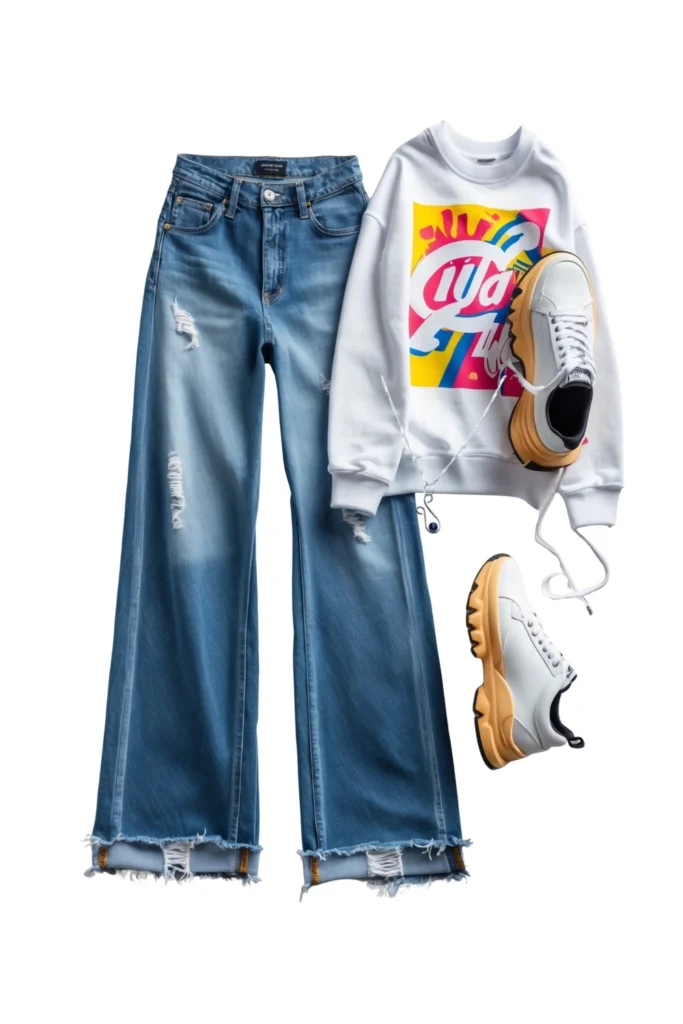 For a playful and relaxed look, I throw on a graphic sweatshirt with my wide leg jeans. It’s cozy, expressive, and surprisingly chic when paired with chunky sneakers or a slick ponytail.