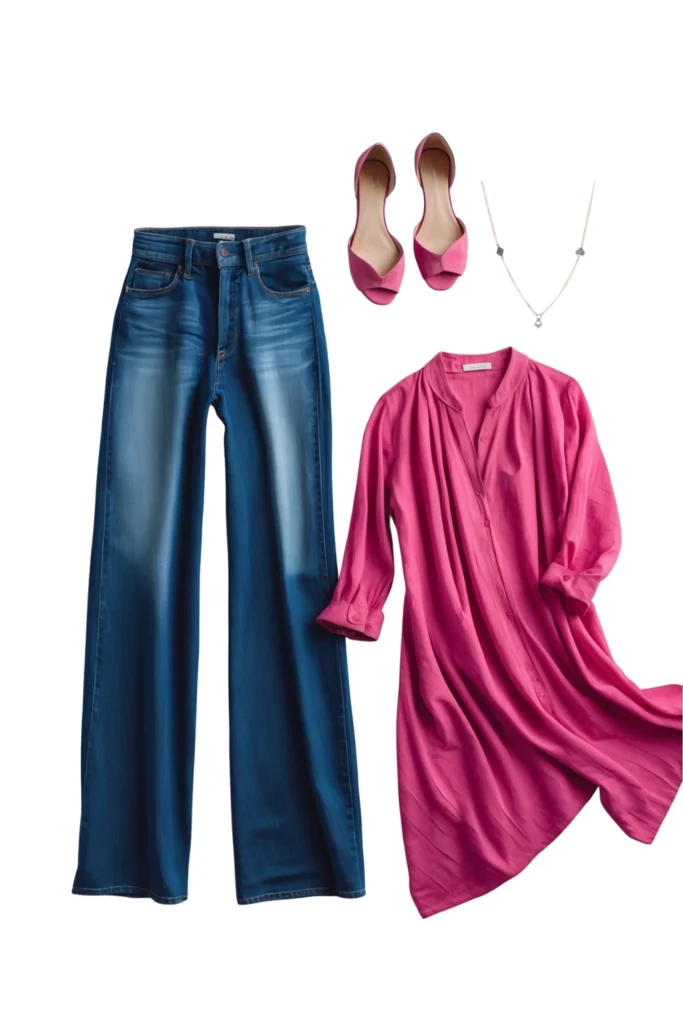 This is my go to when I want to feel relaxed but still put together. A flowy tunic in a bold color looks beautiful over high waisted wide leg jeans. It’s perfect for casual days that still call for a bit of effort.
