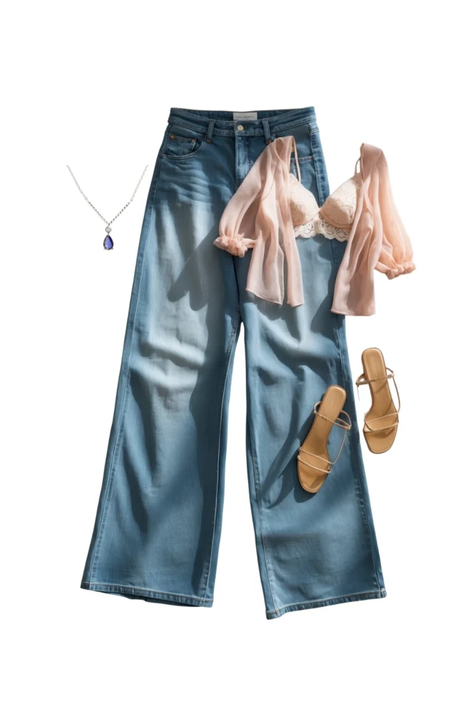A sheer blouse layered over a bralette adds a soft, delicate contrast to wide leg jeans. I wore this combo for a gallery event, and it felt artsy and romantic. Just add minimal gold jewelry to complete the look.